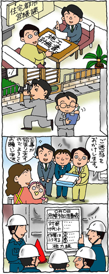 - 当社の営業と工事責任者が工事概要を書いたチラシと粗品を持って、ご近所にご挨拶に回ります。施主様も一緒に同行していただけると、ご近所方々の理解も得られやすく、工事の進行もスムーズです。また工事中の苦情にも丁寧に対応していきます。