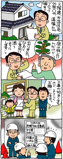 - 施主様、あるいは住宅メーカーさんに見積書を提出してご説明し、納得いただいた上で契約となります。ここで撤去するもの、しないものをあらかじめ確認し合いますが、例えば施主様の「庭木を残したい」というご要望に対し、木の移植時期を踏まえた上でどう対処するかを相談し合います。