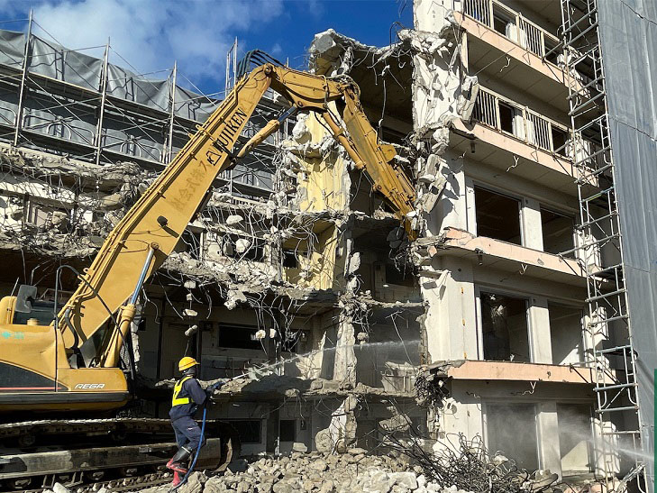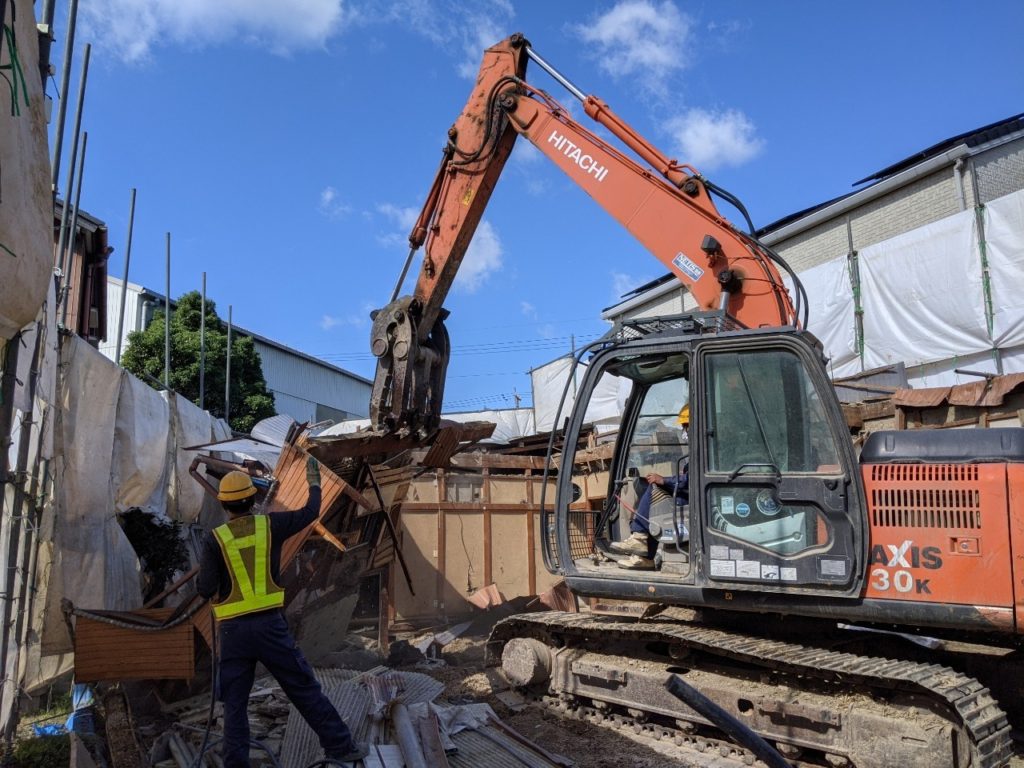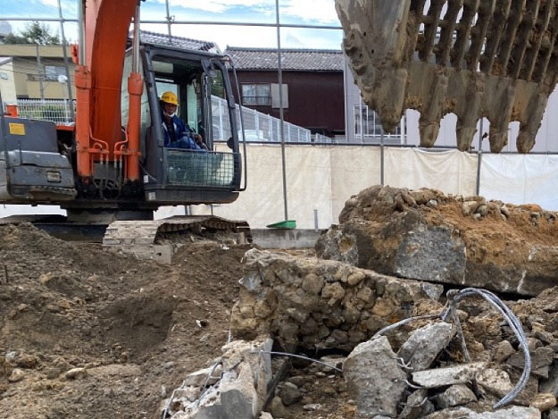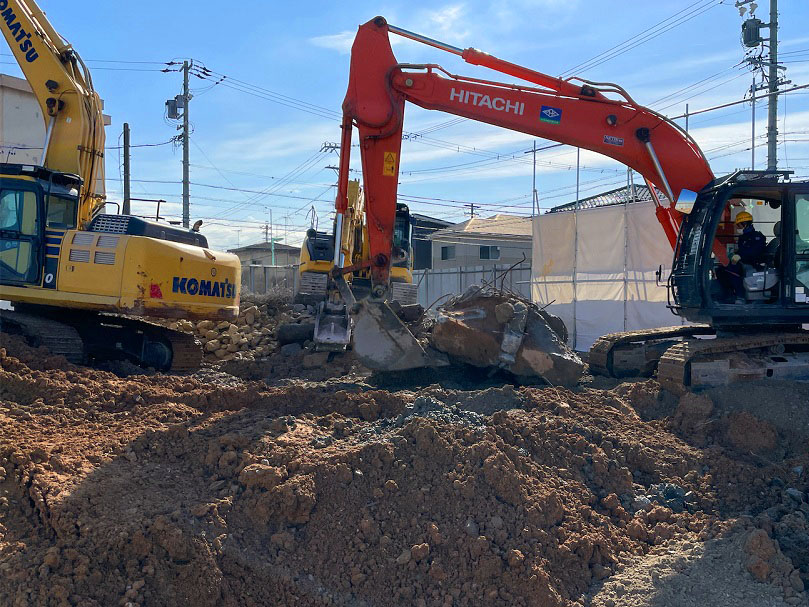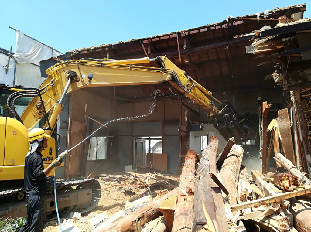 手作業で撤去した後の建物本体は重機により解体し、基礎を掘り起こし撤去します。ホコリの飛散を防ぐため、水をまきながら壊していきます。