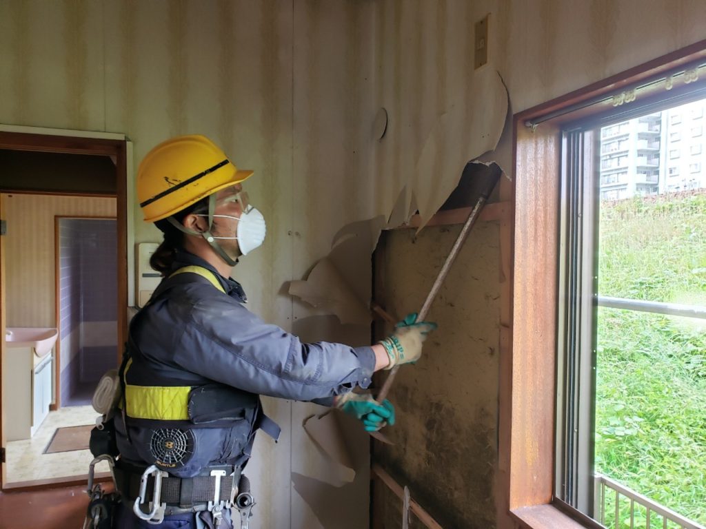 サッシ、畳、断熱材、建具、内部造作、住宅設備機器、石膏ボードなどを、手作業で撤去していきます。