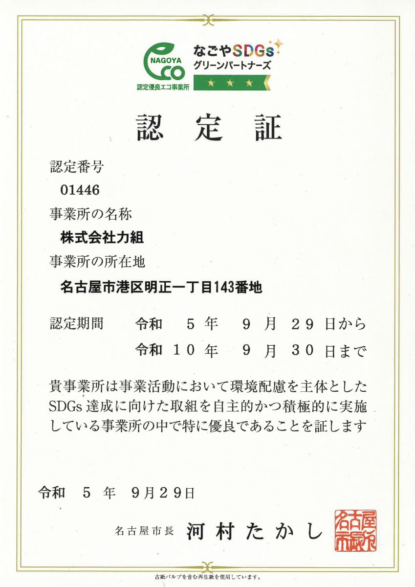 [なごやSDGsグリーンパートナーズ優良エコ事業所]の認定、[愛知県安全なまちづくり・交通安全パートナーシップ企業]にも登録されています。
